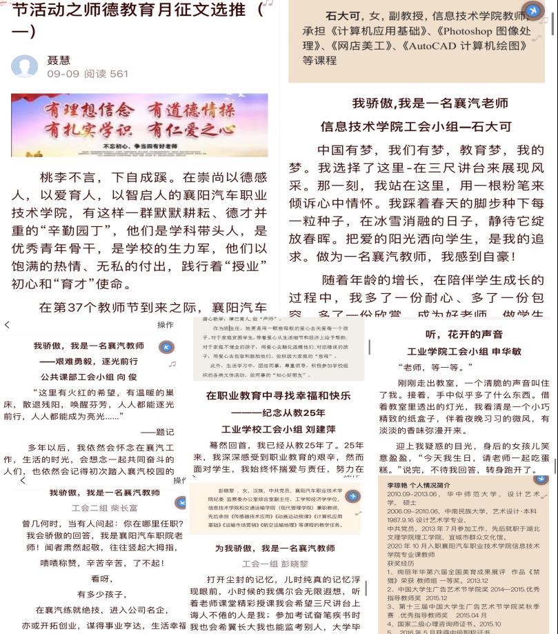 9月10日在学院各电子显示屏滚动播放“赓续百年初心,担当育人使命”“热烈庆祝第37个教师节”系列宣传标语,在全院推送师德教育月活动征文“我骄傲,我是一名襄汽教师”征文,弘扬尊师重教传统,营造尊师重教氛围,引领师生不忘初心,奋进担当。